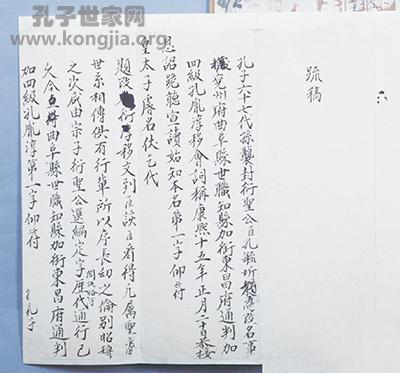 由此可见,孔氏家族的家族族谱辈分传承问题,是一件非常严肃的事情。康熙十四年(1675年),康熙立时年两岁的二阿哥胤礽为皇太子,康熙十五年,清王朝下诏加衔曲阜县世职知县东昌府通判。加衔听封,让孔氏后裔知道孔氏家族族谱辈分胤字冲撞了皇太子睿名,遂主张改为衍字。这则档案就是孔衍淳奏请六十七代衍圣公孔毓圻其对孔氏家族族谱辈分的修改是由,并上疏建议衍圣公“序长幼之伦,别昭穆之次”,将孔氏族人“其余圣裔现任职官及在部有名”的人的孔氏家族族谱辈分“胤”字改为“衍”字。