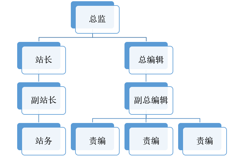 本站组织架构自上而下依次为:总监、站长、总编辑、副站长、副总编辑、责任编辑、站务。